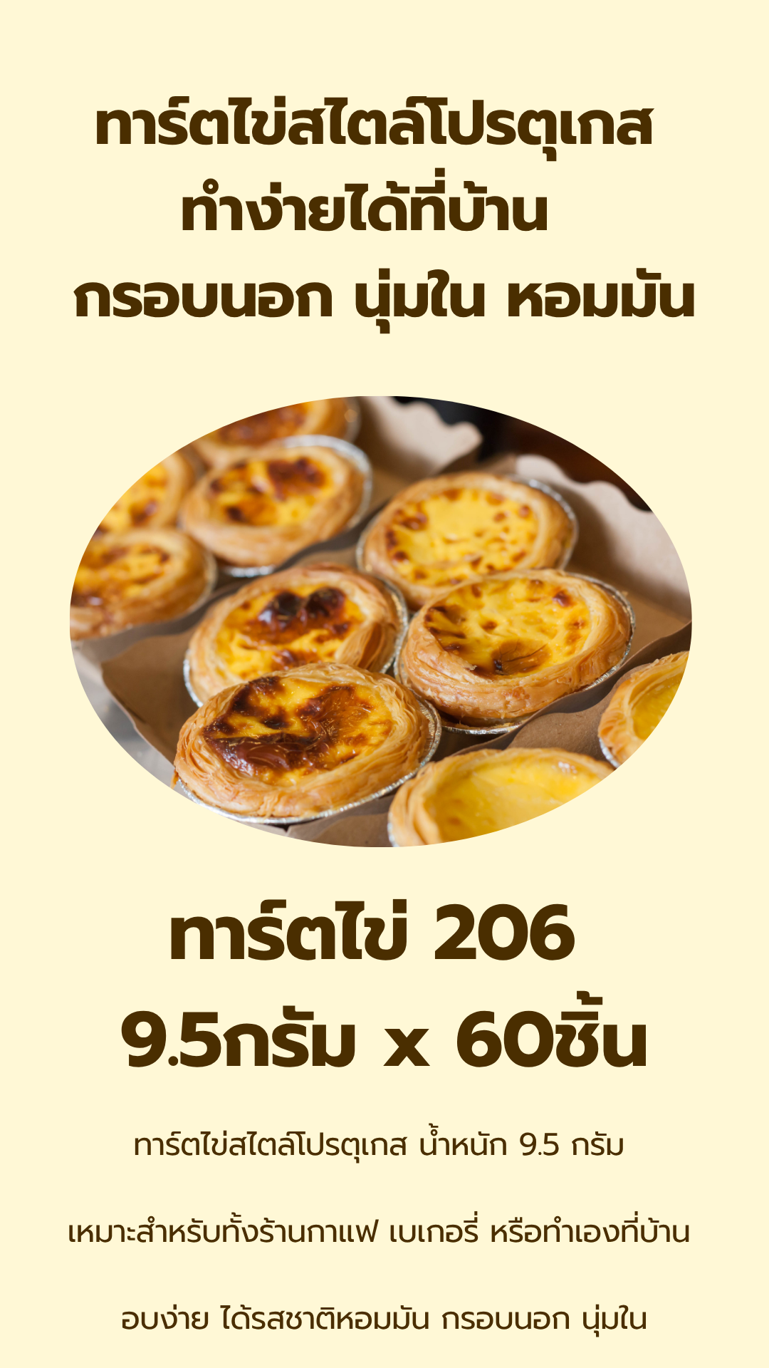สามารถใช้ได้พอดีกับจำนวน 60 ชิ้น โดยบีบครีมลงในถ้วยทาร์ตชิ้นละประมาณ 15 กรัม (ประมาณ 80% ของทาร์ตไข่)